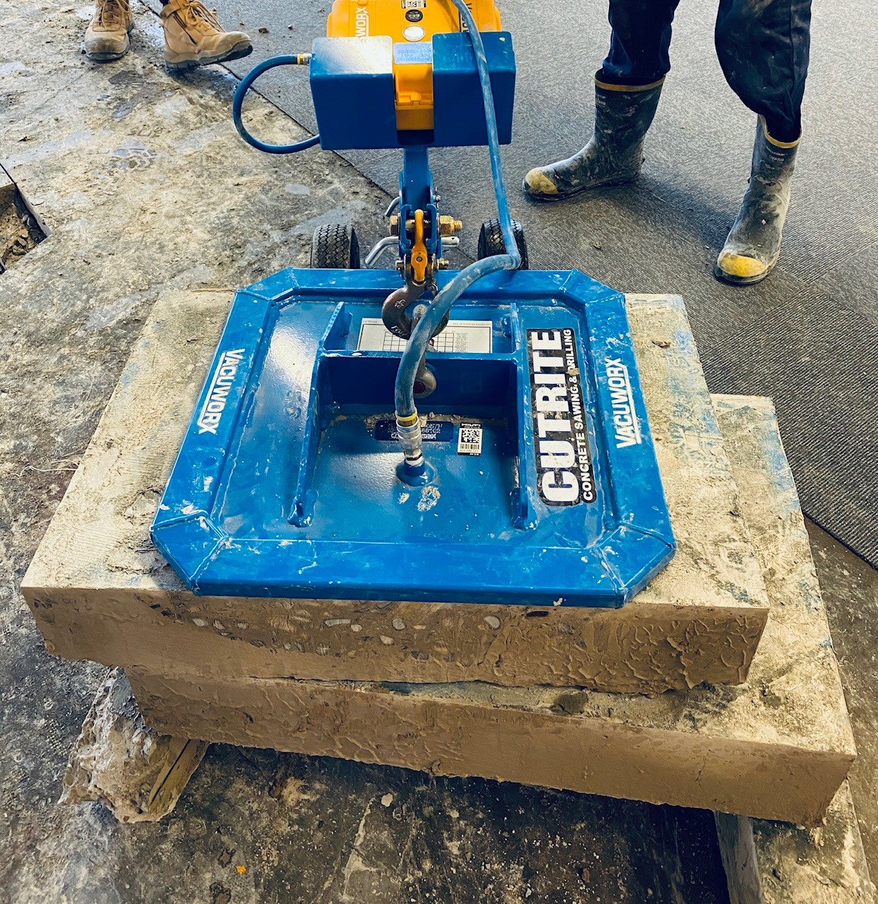 Removal of suspended slab to create penetration for stair case using the floor saw featuring our new lifting vacuum.